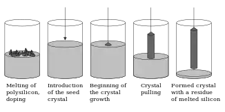 Wafers are formed of highly pure,[6] nearly defect-free single crystalline material, with a purity of 99.9999999% (9N) or higher.[6] One process for forming crystalline wafers is known as the Czochralski method, invented by Polish chemist Jan Czochralski. In this process, a cylindrical ingot of high purity monocrystalline semiconductor, such as silicon or germanium, called a boule, is formed by pulling a seed crystal from a melt.[7][8] Donor impurity atoms, such as boron or phosphorus in the case of silicon, can be added to the molten intrinsic material in precise amounts in order to dope the crystal, thus changing it into an extrinsic semiconductor of n-type or p-type.
