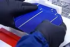 The boule is then sliced with a wafer saw (a type of wire saw), machined to improve flatness, chemically etched to remove crystal damage from machining steps and finally polished to form wafers.[9] The size of wafers for photovoltaics is 100–200 mm square and the thickness is 100–500 μm.[10] Electronics use wafer sizes from 100 to 450 mm diameter. The largest wafers made have a diameter of 450 mm,[11] but are not yet in general use.