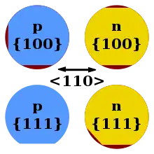 Wafers under 200 mm diameter have flats cut into one or more sides indicating the crystallographic planes of the wafer (usually a {110} face). In earlier-generation wafers a pair of flats at different angles additionally conveyed the doping type (see illustration for conventions). Wafers of 200 mm diameter and above use a single small notch to convey wafer orientation, with no visual indication of doping type. 450 mm wafers are notchless, relying on a laser scribed structure on the wafer surface for orientation.[24]