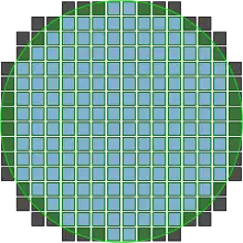 This formula simply states that the number of dies which can fit on the wafer cannot exceed the area of the wafer divided by the area of each individual die. It will always overestimate the true best-case gross DPW, since it includes the area of partially patterned dies which do not fully lie on the wafer surface (see figure). These partially patterned dies don't represent complete ICs, so they cannot be sold as functional parts.