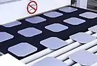 • Bottom left: A 3D rendering of solar wafers on a conveyor. Bottom right: completed solar wafers
