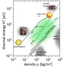 Warm dense matter, abbreviated WDM, can refer to either equilibrium or non-equilibrium states of matter in a (loosely defined) regime of temperature and density between condensed matter and hot plasma. It can be defined as the state that is too dense to be described by weakly coupled plasma physics yet too hot to be described by condensed matter physics. In this state, the potential energy of the Coulomb interaction between electrons and ions is on the same order of magnitude (or even significantly exceeds) their thermal energy, while the latter is comparable to the Fermi energy.[1] Typically, WDM has a density somewhere between 0.01 and 100 g/cm3 and a temperature on the order of several thousand kelvins (somewhere between 1 and 100 eV, in the units favored by practitioners).