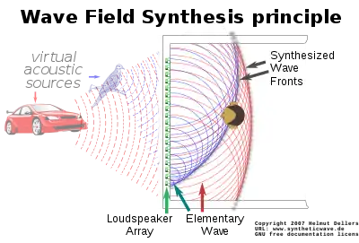 WFS is based on the Huygens–Fresnel principle, which states that any wavefront can be regarded as a superposition of spherical elementary waves. Therefore, any wavefront can be synthesized from such elementary waves. In practice, a computer controls a large array of individual loudspeakers and actuates each one exactly by the time and level, at which the desired virtual wavefront would pass through its point. By that way from a mono signal source a genuine wave front of a sound source may by restored.