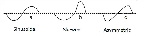 In probability theory and statistics, skewness refers to a distortion or asymmetry that deviates from a normal distribution. Waves that are asymmetric along the horizontal axis are called skewed waves. Asymmetry along the horizontal axis indicates that the wave crest deviates from the wave trough in terms of duration and height. Generally, skewed waves have a short and high wave crest and a long and flat wave trough.[6] A skewed wave shape results in larger orbital velocities under the wave crest compared to smaller orbital velocities under the wave trough. For waves having the same velocity variance, the ones with higher skewness result in a larger net sediment transport.[7][8]