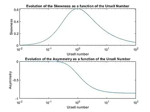 For small Ursell numbers, the skewness and asymmetry both approach zero and the waves have a sinusoidal shape, and thus waves having small Ursell numbers do not result in net sediment transport. For , the skewness is maximum and the asymmetry is small and the waves have a skewed shape. For large Ursell numbers, the skewness approaches 0 and the asymmetry is maximum, resulting in an asymmetric wave shape. In this way, if the wave shape is known, the Ursell number can be predicted and consequently the size and direction of sediment transport at a certain location can be predicted.[13]