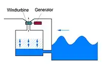 Oscillating water column devices can be located onshore or offshore. Swells compress air in an internal chamber, forcing air through a turbine to create electricity.[42] Significant noise is produced as air flows through the turbines, potentially affecting nearby birds and marine organisms. Marine life could possibly become trapped or entangled within the air chamber.[38] It draws energy from the entire water column.[43]