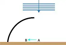 Wave setup can lead to considerable currents along the coast. In the accompanying figure, a harbour is drawn with waves that come perpendicular to the coast. At point A, the breaking of the waves causes a water level increase. Suppose it is 1.2 m as in the example above. At point B in the harbour (suppose that is approx. 500 m from point A) there are few breaking waves due to the protection of the breakwater (there is a small amount of wave action due to diffraction).