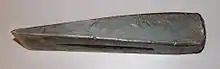 A wedge is a triangular shaped tool, a portable inclined plane, and one of the six simple machines. It can be used to separate two objects or portions of an object, lift up an object, or hold an object in place. It functions by converting a force applied to its blunt end into forces perpendicular (normal) to its inclined surfaces. The mechanical advantage of a wedge is given by the ratio of the length of its slope to its width.[1][2] Although a short wedge with a wide angle may do a job faster, it requires more force than a long wedge with a narrow angle.