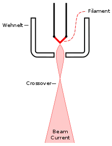 A Wehnelt acts as a control grid and it also serves as a convergent electrostatic lens. An electron emitter is positioned directly above the Wehnelt aperture, and an anode is located below the Wehnelt. The anode is biased to a high positive voltage (typically +1 kV to +30 kV) relative to the emitter so as to accelerate electrons from the emitter towards the anode, thus creating an electron beam that passes through the Wehnelt aperture.