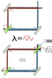 The Wheeler version of the interferometer experiment could not be performed in a laboratory until recently because of the practical difficulty of inserting or removing the second beam-splitter in the brief time interval between the photon's entering the first beam-splitter and its arrival at the location provided for the second beam-splitter. This realization of the experiment is done by extending the lengths of both paths by inserting long lengths of fiber optic cable. So doing makes the time interval involved with transits through the apparatus much longer. A high-speed switchable device on one path, composed of a high-voltage switch, a Pockels cell, and a Glan–Thompson prism, makes it possible to divert that path away from its ordinary destination so that path effectively comes to a dead end. With the detour in operation, nothing can reach either detector by way of that path, so there can be no interference. With it switched off the path resumes its ordinary mode of action and passes through the second beam-splitter, making interference reappear. This arrangement does not actually insert and remove the second beam-splitter, but it does make it possible to switch from a state in which interference appears to a state in which interference cannot appear, and do so in the interval between light entering the first beam-splitter and light exiting the second beam-splitter. If photons had "decided" to enter the first beam-splitter as either waves or a particles, they must have been directed to undo that decision and to go through the system in their other guise, and they must have done so without any physical process being relayed to the entering photons or the first beam-splitter because that kind of transmission would be too slow even at the speed of light. Wheeler's interpretation of the physical results would be that in one configuration of the two experiments a single copy of the wavefunction of an entering photon is received, with 50% probability, at one or the other detectors, and that under the other configuration two copies of the wave function, traveling over different paths, arrive at both detectors, are out of phase with each other, and therefore exhibit interference. In one detector the wave functions will be in phase with each other, and the result will be that the photon has 100% probability of showing up in that detector. In the other detector the wave functions will be 180° out of phase, will cancel each other exactly, and there will be a 0% probability of their related photons showing up in that detector.[17]