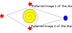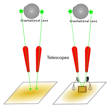 The cosmic experiment envisioned by Wheeler could be described either as analogous to the interferometer experiment or as analogous to a double-slit experiment. The important thing is that by a third kind of device, a massive stellar object acting as a gravitational lens, photons from a source can arrive by two pathways. Depending on how phase differences between wavefunction pairs are arranged, correspondingly different kinds of interference phenomena can be observed. Whether to merge the incoming wavefunctions or not, and how to merge the incoming wavefunctions can be controlled by experimenters. There are none of the phase differences introduced into the wavefunctions by the experimental apparatus as there are in the laboratory interferometer experiments, so despite there being no double-slit device near the light source, the cosmic experiment is closer to the double-slit experiment. However, Wheeler planned for the experiment to merge the incoming wavefunctions by use of a beam splitter.[18]
