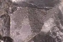 In 1903, Crookes turned his attention to the newly discovered phenomenon of radioactivity, achieving the separation from uranium of its active transformation product, uranium-X (later established to be protactinium).[38] Crookes observed the gradual decay of the separated transformation product, and the simultaneous reproduction of a fresh supply in the original uranium. At about the same time as this important discovery, he observed that when "p-particles", ejected from radio-active substances, impinge upon zinc sulfide, each impact is accompanied by a minute scintillation, an observation which forms the basis of one of the most useful methods in the detection of radioactivity.[39]