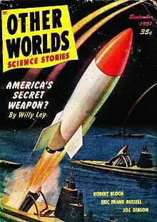 In 1936, he supervised operations of two rocket planes carrying mail at Greenwood Lake, New York.[12] Ley was an avid reader of science fiction, and began publishing scientific articles in American science fiction magazines, beginning with "The Dawn of the Conquest of Space" in the March 1937 issue of Astounding Stories. In the February 1937 issue of that same magazine, he had published a science fiction short story "At the Perihelion" under the pseudonym Robert Wiley, which was later reprinted as "A Martian Adventure" in the 1962 anthology Great Science Fiction by Scientists (Collier Books, Groff Conklin, ed.). He was a member of science fiction fandom as well, attending science fiction conventions, and was eventually a Guest of Honor at Philcon II, the 1953 World Science Fiction Convention.
