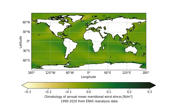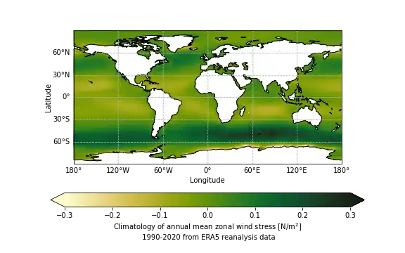 The global annual mean wind stress forces the global ocean circulation. Typical values for the wind stress are about 0.1Pa and, in general, the zonal wind stress is stronger than the meridional wind stress as can be seen in figures 2.1 and 2.2. It can also be seen that the largest values of the wind stress occur in the Southern Ocean for the zonal direction with values of about 0.3Pa. Figures 2.3 and 2.4 show that monthly variations in the wind stress patterns are only minor and the general patterns stay the same during the whole year. It can be seen that there are strong easterly winds (i.e. blowing toward the West), called easterlies or trade winds near the equator, very strong westerly winds at midlatitudes (between ±30° and ±60°), called westerlies, and weaker easterly winds at polar latitudes. Also, on a large annual scale, the wind-stress field is fairly zonally homogeneous. Important meridional wind stress patterns are northward (southward) currents on the eastern (western) coasts of continents in the Northern Hemisphere and on the western (eastern) coast in the Southern Hemisphere since these generate coastal upwelling which causes biological activity. Examples of such patterns can be observed in figure 2.2 on the East coast of North America and on the West coast of South America.[4][1]