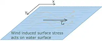 Here, F represents the shear force, represents the air density and represents the wind shear stress. Furthermore, x corresponds to the zonal direction and y corresponds to the meridional direction. The vertical derivatives of the wind stress components are also called the vertical eddy viscosity.[5] The equation describes how the force exerted on the water surface decreases for a denser atmosphere or, to be more precise, a denser atmospheric boundary layer (this is the layer of a fluid where the influence of friction is felt). On the other hand, the exerted force on the water surface increases when the vertical eddy viscosity increases. The wind stress can also be described as a downward transfer of momentum and energy from the air to the water.