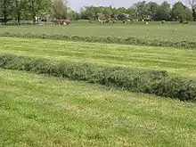 A windrow is a row of cut (mown) hay or small grain crop.[1] It is allowed to dry before being baled, combined, or rolled. For hay, the windrow is often formed by a hay rake, which rakes hay that has been cut by a mowing machine or by scythe into a row, or it may naturally form as the hay is mown. For small grain crops which are to be harvested, the windrow is formed by a swather which both cuts the crop and forms the windrow.