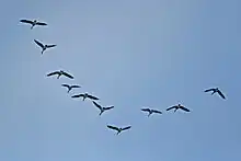 One theory on migrating bird flight states that many larger bird species fly in a V formation so that all but the leader bird can take advantage of the upwash part of the wingtip vortex of the bird ahead.[8][9]