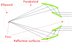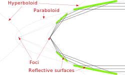 X-ray mirrors can be built, but only if the angle from the plane of reflection is very low (typically 10 arc-minutes to 2 degrees).[2] These are called glancing (or grazing) incidence mirrors. In 1952, Hans Wolter outlined three ways a telescope could be built using only this kind of mirror.[3][4] These are called Wolter telescopes of type I, II, and III.[5] Each has different advantages and disadvantages.[6]
