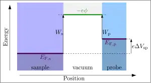 The Kelvin probe technique relies on the detection of an electric field (gradient in ϕ) between a sample material and probe material. The electric field can be varied by the voltage ΔVsp that is applied to the probe relative to the sample. If the voltage is chosen such that the electric field is eliminated (the flat vacuum condition), then