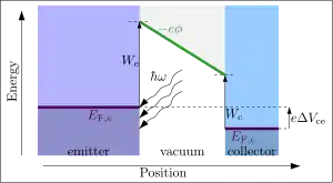 The current is still governed by Richardson's law. However, in this case the barrier height does not depend on We. The barrier height now depends on the work function of the collector, as well as any additional applied voltages:[11]