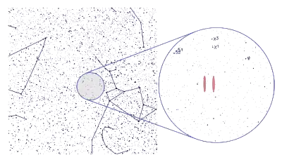 The galactic coordinates for the positive horn are l=11.7°, b=−18.9°, and for the negative horn l=11.9°, b=−19.5°, both being therefore about 19° toward the southeast of the galactic plane, and about 24° or 25° east of the Galactic Center. The region of the sky in question lies northwest of the globular cluster M55, in the constellation Sagittarius, roughly 2.5 degrees south of the fifth-magnitude star group Chi Sagittarii, and about 3.5 degrees south of the plane of the ecliptic. The closest easily visible star is Tau Sagittarii.[18]