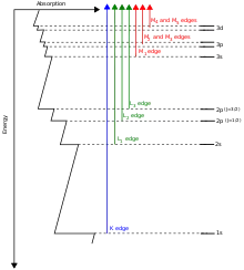 XAS data is obtained by tuning the photon energy,[3] using a crystalline monochromator, to a range where core electrons can be excited (0.1-100 keV). The edges are, in part, named by which core electron is excited: the principal quantum numbers n = 1, 2, and 3, correspond to the K-, L-, and M-edges, respectively.[4] For instance, excitation of a 1s electron occurs at the K-edge, while excitation of a 2s or 2p electron occurs at an L-edge (Figure 1).