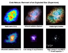 In the Crab Nebula X-ray spectrum there are three features that differ greatly from Scorpius X-1: its spectrum is much harder, its source diameter is in light-years (ly)s, not astronomical units (AU), and its radio and optical synchrotron emission are strong.[24] Its overall X-ray luminosity rivals the optical emission and could be that of a nonthermal plasma. However, the Crab Nebula appears as an X-ray source that is a central freely expanding ball of dilute plasma, where the energy content is 100 times the total energy content of the large visible and radio portion, obtained from the unknown source.[24]