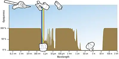 X-ray astronomy is an observational branch of astronomy which deals with the study of X-ray observation and detection from astronomical objects. X-radiation is absorbed by the Earth's atmosphere, so instruments to detect X-rays must be taken to high altitude by balloons, sounding rockets, and satellites. X-ray astronomy uses a type of space telescope that can see x-ray radiation which standard optical telescopes, such as the Mauna Kea Observatories, cannot.
