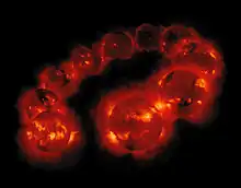 X-ray emission for pre–main-sequence stars was discovered by the Einstein Observatory.[38][39] This X-ray emission is primarily produced by magnetic reconnection flares in the stellar coronae, with many small flares contributing to the "quiescent" X-ray emission from these stars.[40] Pre–main sequence stars have large convection zones, which in turn drive strong dynamos, producing strong surface magnetic fields. This leads to the high X-ray emission from these stars, which lie in the saturated X-ray regime, unlike main-sequence stars that show rotational modulation of X-ray emission. Other sources of X-ray emission include accretion hotspots[41] and collimated outflows.[42]