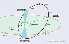 Ulysses was launched October 6, 1990, and reached Jupiter for its "gravitational slingshot" in February 1992. It passed the south solar pole in June 1994 and crossed the ecliptic equator in February 1995. The solar X-ray and cosmic gamma-ray burst experiment (GRB) had 3 main objectives: study and monitor solar flares, detect and localize cosmic gamma-ray bursts, and in-situ detection of Jovian aurorae. Ulysses was the first satellite carrying a gamma burst detector which went outside the orbit of Mars. The hard X-ray detectors operated in the range 15–150 keV. The detectors consisted of 23-mm thick × 51-mm diameter CsI(Tl) crystals mounted via plastic light tubes to photomultipliers. The hard detector changed its operating mode depending on (1) measured count rate, (2) ground command, or (3) change in spacecraft telemetry mode. The trigger level was generally set for 8-sigma above background and the sensitivity is 10−6 erg/cm2 (1 nJ/m2). When a burst trigger is recorded, the instrument switches to record high resolution data, recording it to a 32-kbit memory for a slow telemetry read out. Burst data consist of either 16 s of 8-ms resolution count rates or 64 s of 32-ms count rates from the sum of the 2 detectors. There were also 16 channel energy spectra from the sum of the 2 detectors (taken either in 1, 2, 4, 16, or 32 second integrations). During 'wait' mode, the data were taken either in 0.25 or 0.5 s integrations and 4 energy channels (with shortest integration time being 8 s). Again, the outputs of the 2 detectors were summed.