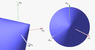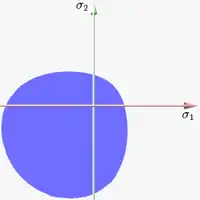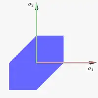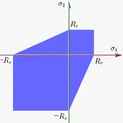 Figure 7 shows Drucker–Prager yield surface in the three-dimensional space of principal stresses. It is a regular cone. Figure 8 shows Drucker–Prager yield surface in two-dimensional space. The elliptical elastic domain is a cross section of the cone on the plane of ; it can be chosen to intersect the Mohr–Coulomb yield surface in different number of vertices. One choice is to intersect the Mohr–Coulomb yield surface at three vertices on either side of the line, but usually selected by convention to be those in the compression regime.[27] Another choice is to intersect the Mohr–Coulomb yield surface at four vertices on both axes (uniaxial fit) or at two vertices on the diagonal (biaxial fit).[28] The Drucker-Prager yield criterion is also commonly expressed in terms of the material cohesion and friction angle.