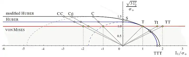 The Huber criterion and the modified Huber criterion should be preferred to the von Mises criterion since one obtains safer results in the region . For practical applications the third invariant of the deviator should be considered in these criteria.[23]