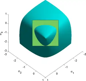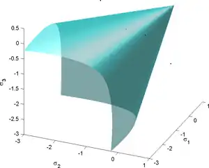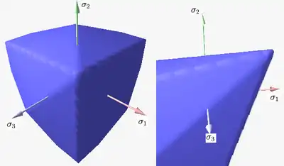 This criterion represents a smooth and convex surface, which is closed both in hydrostatic tension and compression and has a drop-like shape, particularly suited to describe frictional and granular materials. This criterion has also been generalized to the case of surfaces with corners.[45]