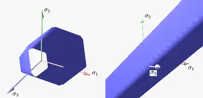 Figure 1 shows the Tresca–Guest yield surface in the three-dimensional space of principal stresses. It is a prism of six sides and having infinite length. This means that the material remains elastic when all three principal stresses are roughly equivalent (a hydrostatic pressure), no matter how much it is compressed or stretched. However, when one of the principal stresses becomes smaller (or larger) than the others the material is subject to shearing. In such situations, if the shear stress reaches the yield limit then the material enters the plastic domain. Figure 2 shows the Tresca–Guest yield surface in two-dimensional stress space, it is a cross section of the prism along the plane.