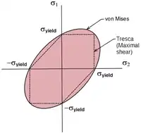 Figure 3 shows the von Mises yield surface in the three-dimensional space of principal stresses. It is a circular cylinder of infinite length with its axis inclined at equal angles to the three principal stresses. Figure 4 shows the von Mises yield surface in two-dimensional space compared with Tresca–Guest criterion. A cross section of the von Mises cylinder on the plane of produces the elliptical shape of the yield surface.