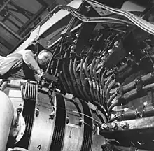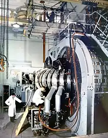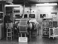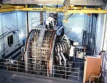 ZETA was the largest and most powerful fusion device in the world at the time of its construction.[54][lower-alpha 4] Its aluminium torus had an internal bore of 1 metre (3 ft 3 in) and a major radius of 1.6 metres (5 ft 3 in), over three times the size of any machine built to date. It was also the most powerful design, incorporating an induction magnet that was designed to induce currents up to 100,000 amperes (amps) into the plasma. Later amendments to the design increased this to 200,000 amps.[55] It included both types of stabilisation; its aluminium walls acted as the metal shield, and a series of secondary magnets ringed the torus.[53] Windows placed in the gaps between the toroidal magnets allowed direct inspection of the plasma.[8]