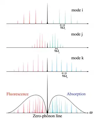 The strength of the zero-phonon transition arises in the superposition of all of the lattice modes. Each lattice mode has a characteristic vibrational frequency which leads to an energy difference between phonons . When the transition probabilities for all the modes are summed, the zero-phonon transitions always add at the electronic origin (), while the transitions with phonons contribute at a distribution of energies. Figure 3 illustrates the superposition of transition probabilities of several lattice modes. The phonon transition contributions from all lattice modes constitute the phonon sideband.